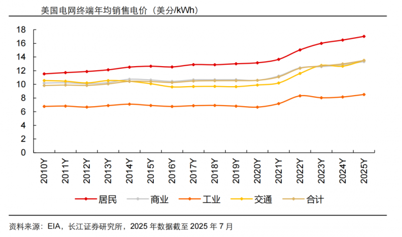 这体现在电价持续飙升上,如 2025 年美国平均销售电价持续上涨,而电网可靠性却在下降,美国电力用户平均停电时长(计入重大灾害后)甚至创下近年来新高。这意味着用户正在以更高的价格,承受更差的服务。提升电网的韧性和可靠性,是迫切的刚需。
